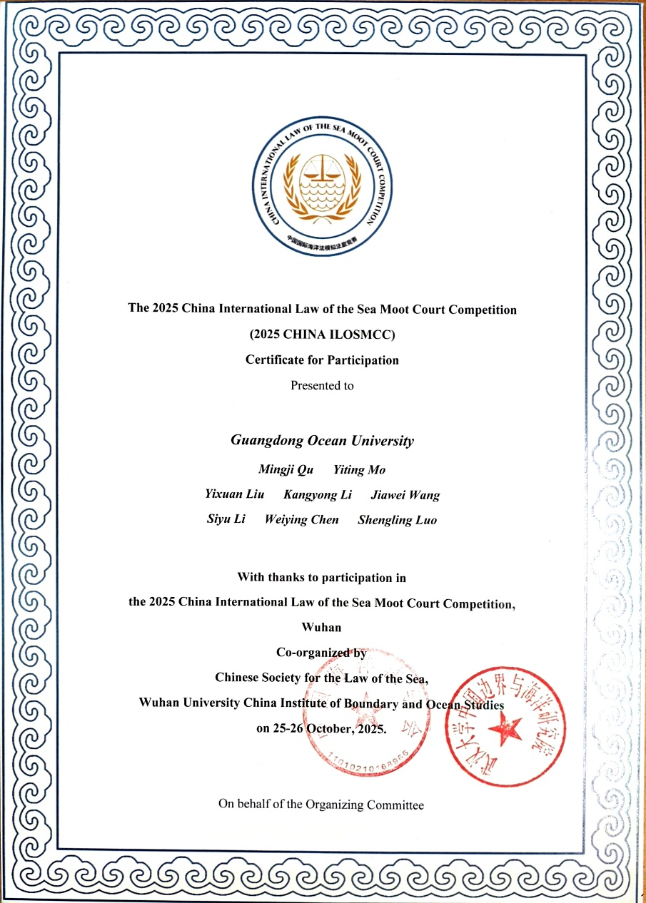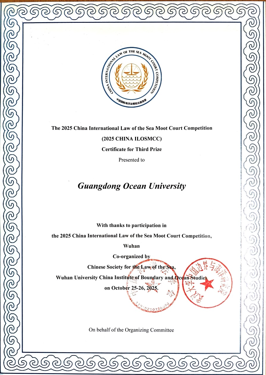 2025年10月26日,由中国海洋法学会、武汉大学主办的2025“中国国际海洋法模拟法庭竞赛”(China International Law of the Sea Moot Court Competition)圆满落下帷幕。本次大赛汇聚了包括清华大学、武汉大学、中国政法大学等在内的众多国内知名高校学子。广东海洋大学代表队在激烈的角逐中脱颖而出,凭借扎实的专业功底和精彩的庭辩表现,最终荣获全国三等奖。