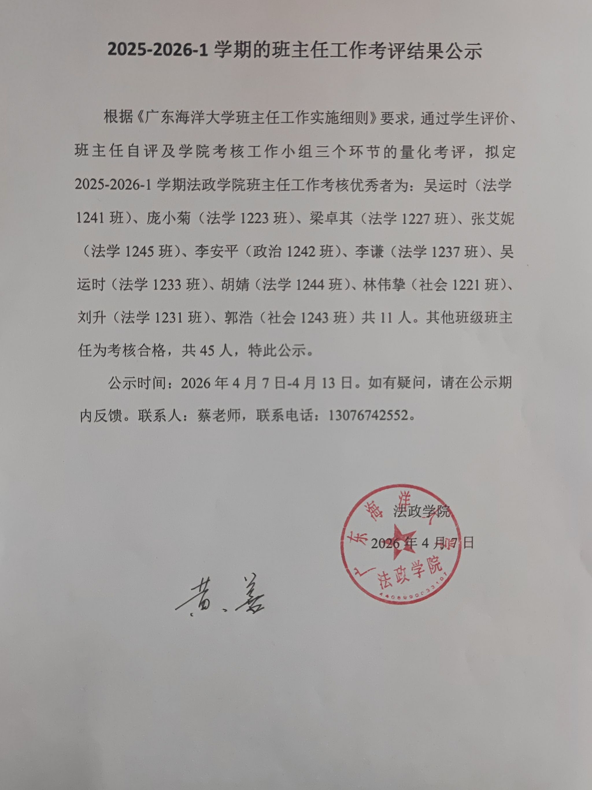 2025-2026-1学期的班主任工作考评结果公示